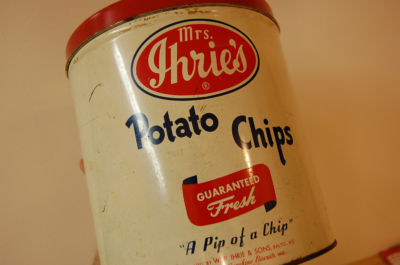 Title (ebay affiliate link): Antique Mrs. Ihrie's Potato Chips tin 12oz w/lid "A Pip of a Chip"