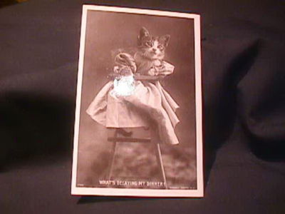 Title (ebay affiliate link): CAT VINTAGE POSTCARD, REAL PHOTO WHATS DELAYIN MY DINNER ENGLISH