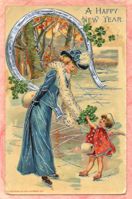 Title (ebay affiliate link): GLOSSY SILVER EMBELLISHED NEW YEAR BEAUTIFUL LADY & CHERUB Horseshoe POSTCARD