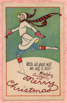 Title (ebay affiliate link): SKATE SKATING GIRL HAPPY BIRTHDAY AND CHRISTMAS WISHES Vintage Postcard