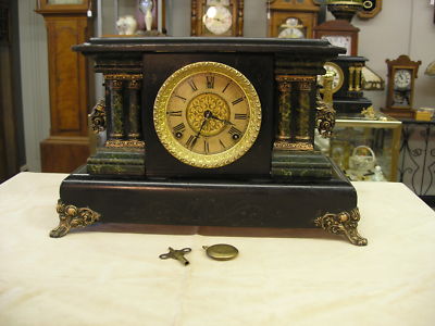 Title (ebay affiliate link): ANTIQUE GILBERT ADAMANTINE STYLE BLACK WOOD MANTLE MANTEL GREEN COLUMN CLOCK !!