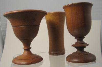 3 PC LOT ANTIQUE TREENWARE SMALL VASES AND DICE CUP