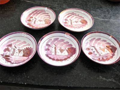 SET OF 5 ANTIQUE PINK LUSTER HOUSE SMALL HOUSE PATTERN DISHES