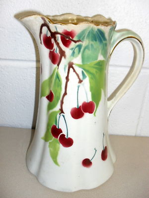 K G Luneville France vase pitcher cherry tree gold trim 10" tall w/handle