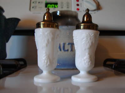 vintage grape leaf milk glass salt and pepper shakers
