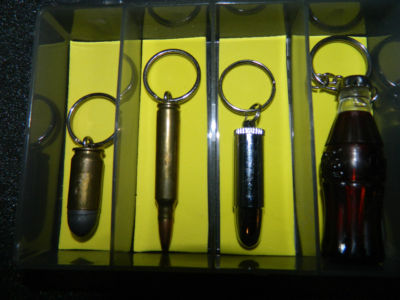 4 VINTAGE KEYCHAINS WITH CASE (COKE, AMMO)