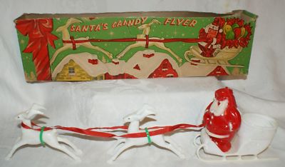 Title (ebay affiliate link): Vintage Rosbro Santa's Candy Flyer Sleigh & Reindeer w/ Box Christmas