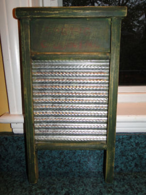 ANTIQUE GREEN WOOD AND METAL WASHBOARD