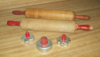 Title (ebay affiliate link): 2 Vintage Red Wood Rolling Pins And 3 Cookie Cutters