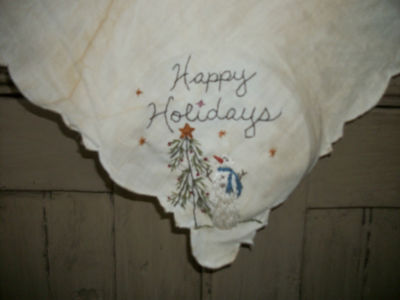 pRiMiTiVe ~ HaPpY HoLiDaYs ~ SeaSonaL SnOwmAn HandStiTchEd LinEn