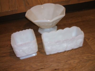 3 VINTAGE ANCHOR HOCKING FIRE KING MILK GLASS COMPOTE,VASE,TROUGH SET GRAPE LEAF