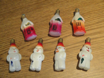 Title (ebay affiliate link): VINTAGE SNOWMAN & COTTAGE MILK GLASS CHRISTMAS LIGHT BULBS - 7 WORKING