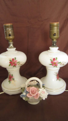 Title (ebay affiliate link): Shabby Pair Of Milk Glass Lamps with Pink Flowers Painted on + 1 Extra Little