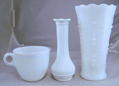 Milk Glass Vase x2, Milk Glass w/ mother of Pearl Cup