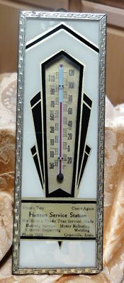 Title (ebay affiliate link): VINTAGE ART DECO REVERSE PAINTING ADVERTISING THERMOMETER~GRANVILLE, IOWA~1940's
