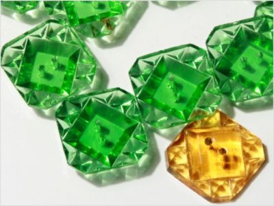 Title (ebay affiliate link): 14 VINTAGE TRANSPARENT DEPRESSION GLASS BUTTONS SQUARES TOPAZ GREEN