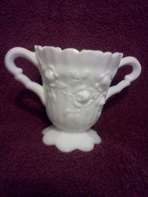 Title (ebay affiliate link): Fenton Raised Roses White Milk Glass Scalloped Edge Sugar Bowl W/Handles