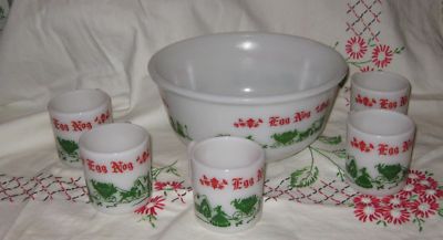Title (ebay affiliate link): VINTAGE Hazel Atlas EGG NOG Bowl Cup Milk Glass Set Christmas Winter Dickens