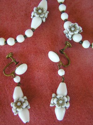 Title (ebay affiliate link): Art Deco White Milk Glass Flower Bead Necklace Bracelet & Earrings Set Germany