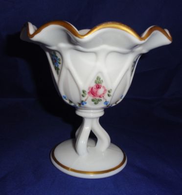 Title (ebay affiliate link): Westmoreland Milk Glass Hand Painted Rose 5" Compote Original Label Excellent