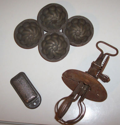 Primitive Kitchen Utensil Lot Bee Brand Grater-Old Jar Beater-Riveted Muffin Tin
