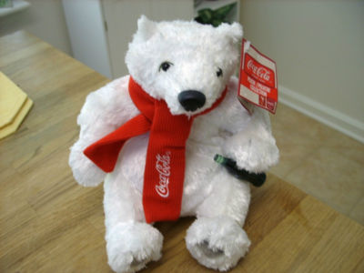 Title (ebay affiliate link): Coca Cola Stuffed Plush White Bear/Red Scarf/Coke in Paw/new with tags/Cavanaugh