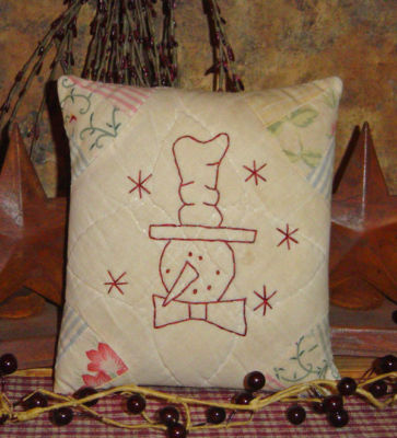 Title (ebay affiliate link): ~REDWORK SNOWMAN ON VINTAGE QUILT~ Primitive Stitchery Sampler Pillow
