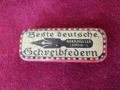 Title (ebay affiliate link): VINTAGE ANTIQUE GERMAN HERM MULLER INK dip PEN NIBS TIN BOX