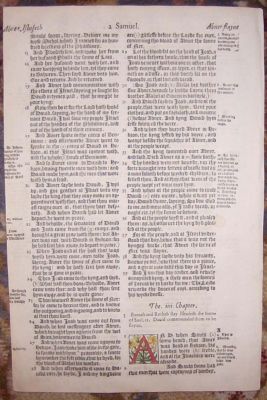 Title (ebay affiliate link): 1578 Bishops Folio Black Letter Bible Leaf/RARE/HAND COLORED WOODCUT/2ND SAMUEL!