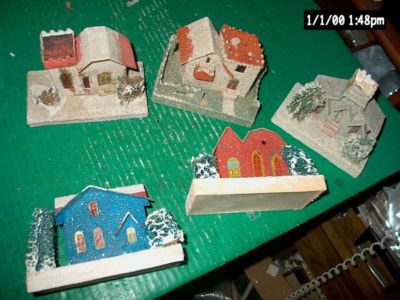 Title (ebay affiliate link): 5 VINTAGE 1950'S PUTZ HOUSES-XMAS ORNAMENTS-SOME HAVE BOTTLE BRUSH TREES-JAPAN
