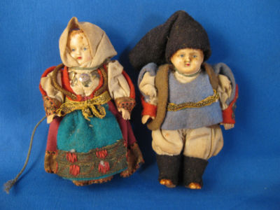 Vntg. Man & Woman, Ukon Dressed, Celluloid Doll Feather Christmas Tree Ornaments