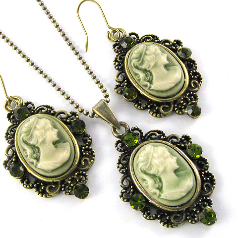 Antique VTG Style Green Cameo Necklace Earrings Set s75