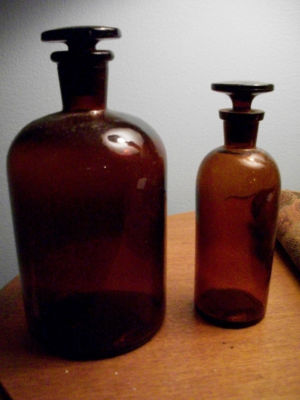 Title (ebay affiliate link): 2 Antique Brown Apothecary Bottles w Ground Stoppers