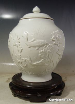RARE WHITE GLAZE PORCELAIN GINGER JAR w FISH 12" H