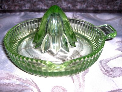 Title (ebay affiliate link): Lime Green Depression era glass citrus juicer/reamer with pouring spout & handle