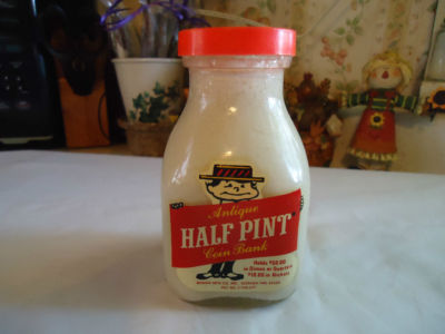 Title (ebay affiliate link): VINTAGE 'BOY W/STRAW HAT' HALF PINT GLASS MILK BOTTLE COIN BANK MBGB-4