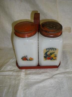 Title (ebay affiliate link): VINTAGE MILK GLASS SALT AND PEPPER SHAKERS WITH RED METAL HOLDER