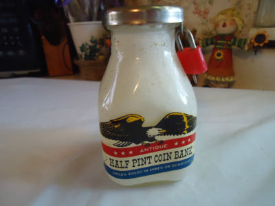 Title (ebay affiliate link): VTG 'EAGLE FACING RIGHT' HALF PINT GLASS MILK BOTTLE COIN BANK E Alton,IL MBGB-6