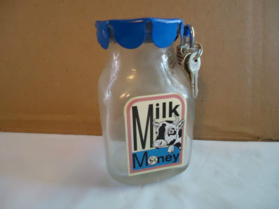Title (ebay affiliate link): '5 CENT MILK MONEY' HALF PINT GLASS MILK BOTTLE COIN BANK w/ lock & 2 Keys