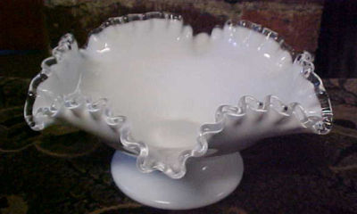 Title (ebay affiliate link): 1957 FENTON WHITE MILK GLASS BOWL SILVER CREST RIBBON TRIM FTD 8 1/2"-lovely