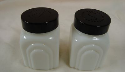20'S 30'S RETRO MILK GLASS BLACK BAKELITE TOP SALT PEPPER SHAKERS