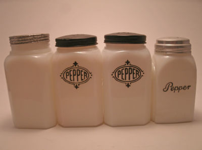Title (ebay affiliate link): Lot 4 Vtg Hazel Atlas milk glass Pepper Shakers (1 not marked) - all have lids