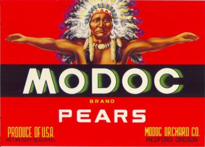 Title (ebay affiliate link): (24) MODOC pear crate labels Medford Or Native American Indian 12 RED & 12 BLACK