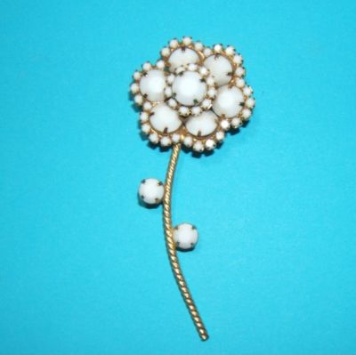 Vintage Milk Glass Rhinestone Flower Pin Brooch