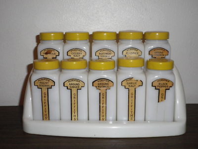 Title (ebay affiliate link): vintage 10 JAR Milk Glass Spice Rack Set Griffith retro Kitchen yellow cap