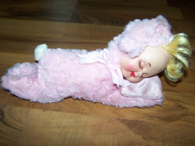 Title (ebay affiliate link): Vintage Stuffed Sleeping Doll Bunny Suit Pink Mohair Toy Girl Antique