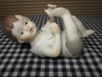 Vintage Piano Baby Porcelain Bisque Brown Hair Playing with Foot
