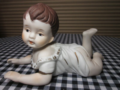 Vintage Piano Baby Porcelain Bisque Brown Hair Laying on Tummy