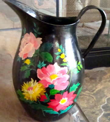 Title (ebay affiliate link): VINTAGE TOLEWARE HAND PAINTED BLACK METAL WATER PITCHER/FLORAL TOLE-PRISTINE!