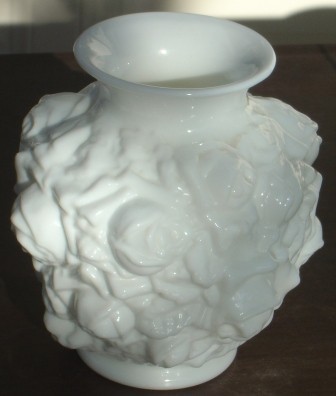 VINTAGE GLASS VASE, ROSE DESIGN, OPAQUE MILK GLASS